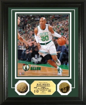 This unique collectible is presented in a wood frame measuring 24 x 30 with a2.5 wide wood frame and laser cut triple matting! The Celtics Grand Highlight includes a 13x19 Photo of the Celtics Big Three Paul Pierce, Ray Allen and Kevin Garnett along with four 3x 5 action images along the right side of each player and Rajon Rondo! This collectible also include four 1.5 in diameter minted Coins; 24KT Gold overlay Boston Celtics Coin, 24KT Gold overlay NBA Coin, 24KT Gold overlay Coin with a Celtics colored Shamrock embedded in the center and a 24KT Gold overlay NBA Playoffs Coin. Each Photo is numbered to match and a numbered Certificate of Authenticity is matted in the center between the Coins. Limited Edition 500 and Officially Licensed by the NBA.