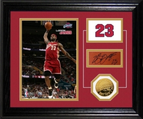 Limited Edition 1000! The Cleveland Cavaliers Star LeBron James is featured on a Highland Mint Exclusive and numbered 8x10 custom Photo presented in double matting and a 13 x 16 wood frame along with a 24KT Gold Overlay Cleveland Cavaliers Coin and a 24KT Gold overlay NBA Coin. A numbered Certificate of Authenticity that also includes his bio info is matted between both Gold coins. Limited Edition 1000 and Officially Licensed by the NBA.