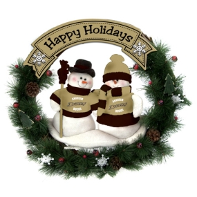 This Anaheim Ducks Snowman Wreath is accented with pine cones, holly berries and two snowmen dressed in official team colors with an official logo. The wreath is 20" in size and is perfect for your holiday home decor, or to give as a gift to that special fan.