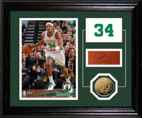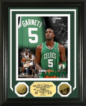 Limited Edition of 1000! Featured in a 13x16 Wood Frame with double matting is an 8x10 collage photo of the Boston Celtics Big 3 Ray Allen, Kevin Garnett, and Paul Pierce! Also included is a Celtics Commemorative Logo Coin and a NBA Shield Coin both minted and 24KT Gold plated measuring 39mm in diameter. Matted between the coins is an individually numbered Certificate of Authenticity. Officially Licensed by the NBA.