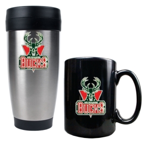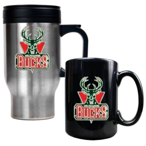 Milwaukee Bucks Stainless Steel Travel Mug & Black Ceramic Mug Set
