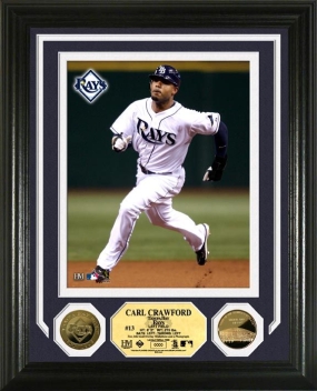 Limited Edition1000 and individually numbered! A commemorative frame with photo and minted Gold Coins! A 13x16 wood frame features triple matted in team color matting a hand numberedTampa Bay Raysteam collage Photo combined with a 39mm minted 24KT Gold platedTampa Bay Raysteam logo and a minted 24KT Gold plated Tropicana Field coin. Matted between both 24KT Gold Coins is an Individually numbered Certificate of Authenticity. Officially Licensed by MLB and MLBPA.